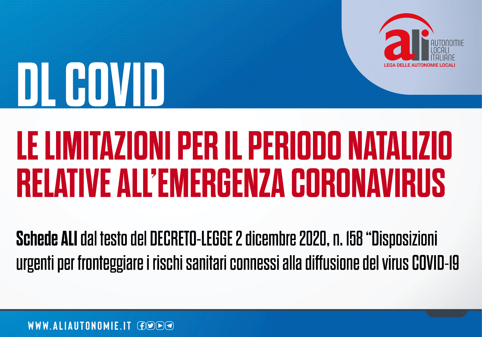 Ma soprattutto si è scelto di adottare un provvedimento di rango superiore, come il decreto legge per limitare lo spostamento tra Regioni. Dal 21 dicembre al 6 gennaio non ci si potrà più spostare infatti neppure tra regioni gialle. Spostamenti vietati anche tra comuni nelle giornate del 25 e del 26 dicembre 2020 e del 1° gennaio 2021. Il decreto («Disposizioni urgenti per fronteggiare i rischi sanitari connessi alla diffusione del virus Covid-19») è stato subito pubblicato sulla Gazzetta Ufficiale 299 del 2 dicembre 2020 con il numero 158.