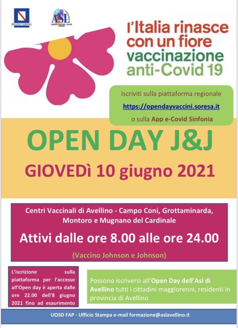 Sono aperte da questa sera alle ore 22. 00 le prenotazioni per aderire all’Open Day con il vaccino Johnson & Johnson promosso dall’Asl di Avellino per giovedì 10 giugno 2021.