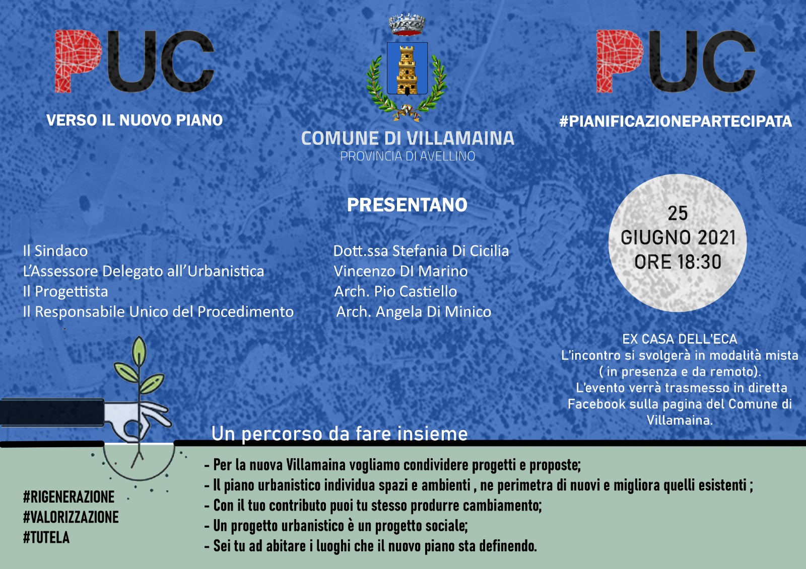 Il percorso che porta al nuovo Piano Urbanistico Comunale di Villamaina si articola in tre capitoli fondamentali: la definizione di ciascuno dei nuovi strumenti introdotti dalla lr 16/2004 che integrano il PUC; la messa a punto e l’utilizzo di strumenti metodologici conoscitivi del territorio e partecipativi nei confronti della comunità insediata; la formulazione di politiche di settore per la casa, i servizi, la produzione, il commercio, il turismo, il territorio agricolo e la mobilità.