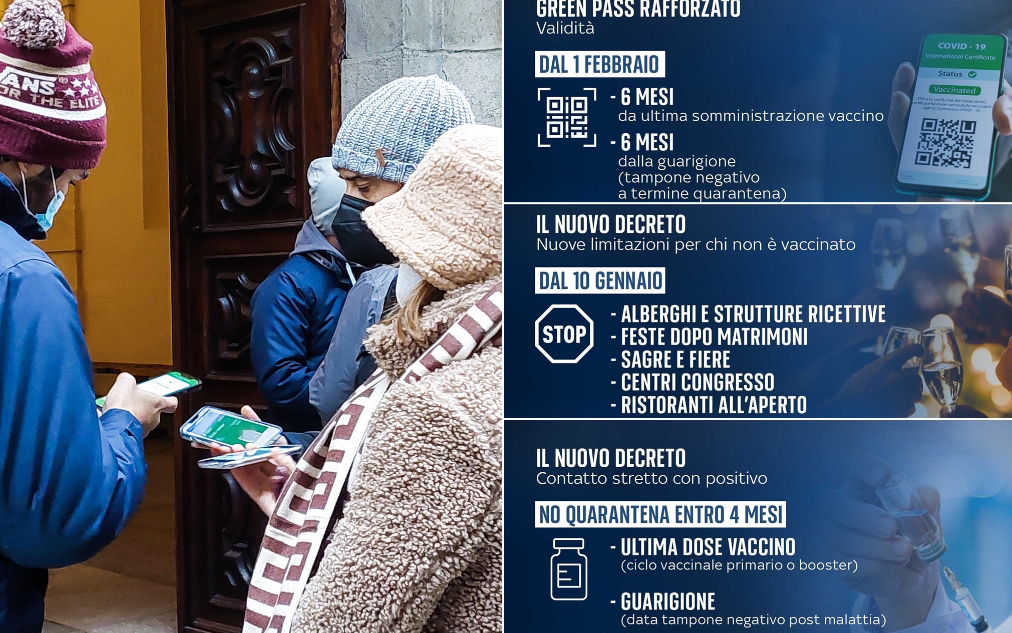 Il Consiglio dei Ministri ha approvato il 29 dicembre 2021 il nuovo decreto sull’estensione del super green pass e sulla riduzione delle quarantene. La misura è valida anche per chi ha completato il ciclo vaccinale da meno di 4 mesi. Per chi ha eseguito l’ultima vaccinazione da più di quattro mesi, l’isolamento scende da 7 a 5 giorni con tampone. Per i non vaccinati resta di 10 giorni. L’obbligo di Super green pass per i lavoratori non è passato, ma il suo uso, dal 10 gennaio, viene esteso a trasporti pubblici, alberghi, ristoranti all’aperto, impianti sciistici.